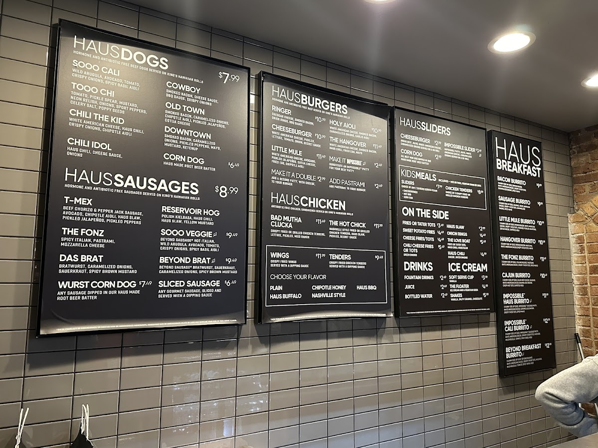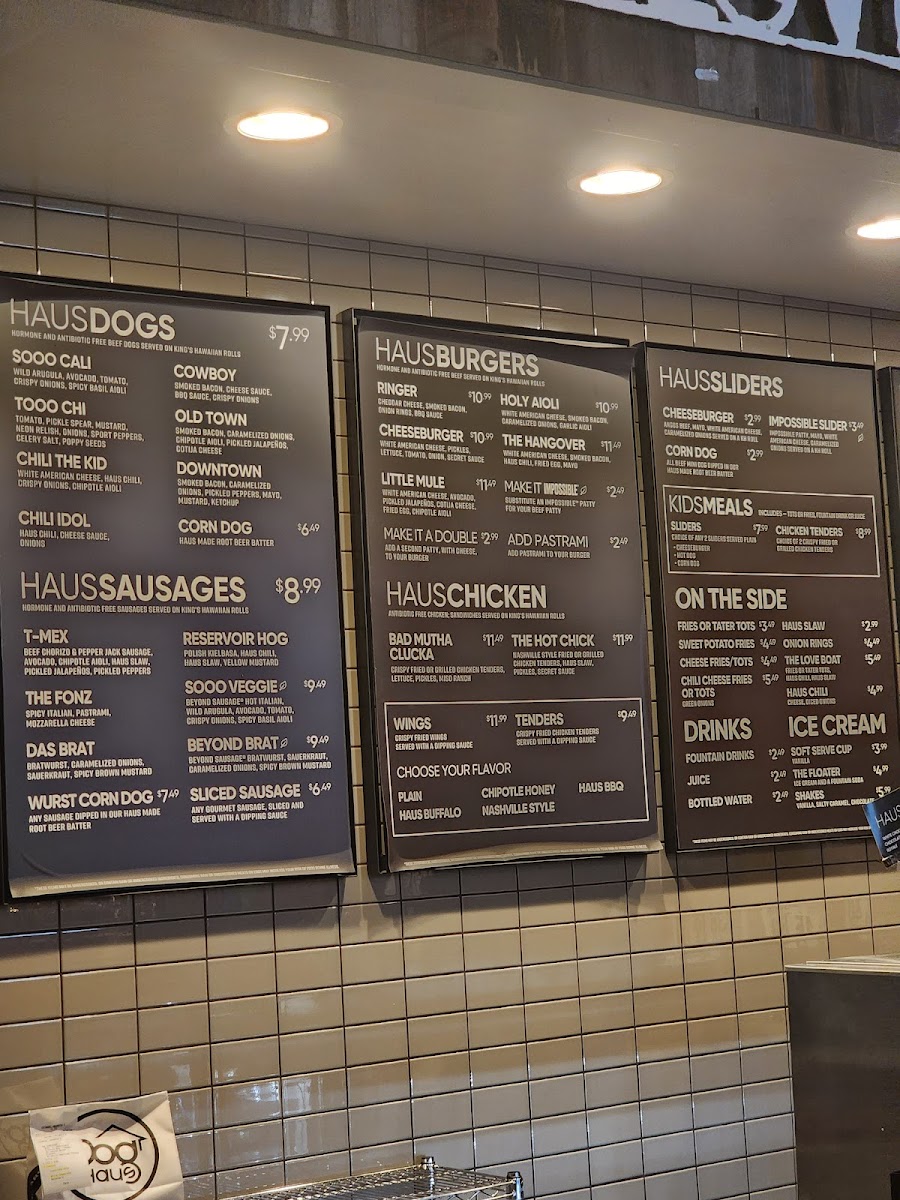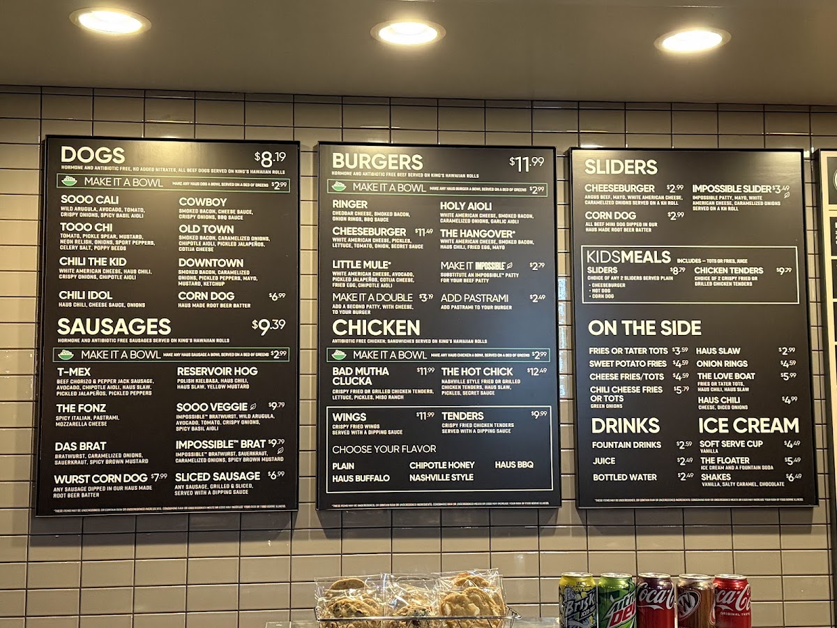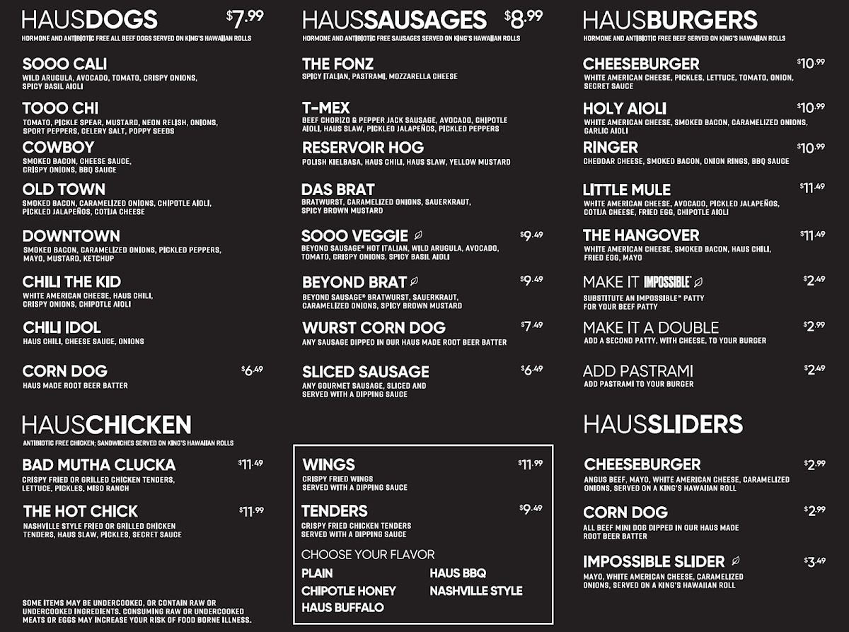 white american cheese, haus chili, crispy onions, chipotle aioli atop our proprietary creekstone farms hormone- and antibiotic-free premium angus all beef dog; on grilled king’s hawaiian rolls