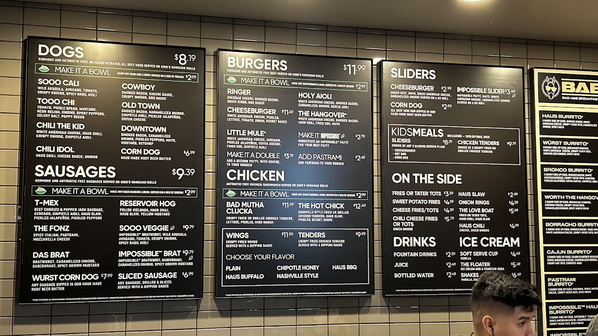 avocado, chipotle aioli, haus slaw, pickled jalapeños & pickled peppers atop our proprietary hormone- and antibiotic-free beef chorizo & pepper jack sausage; on grilled king's hawaiian rolls